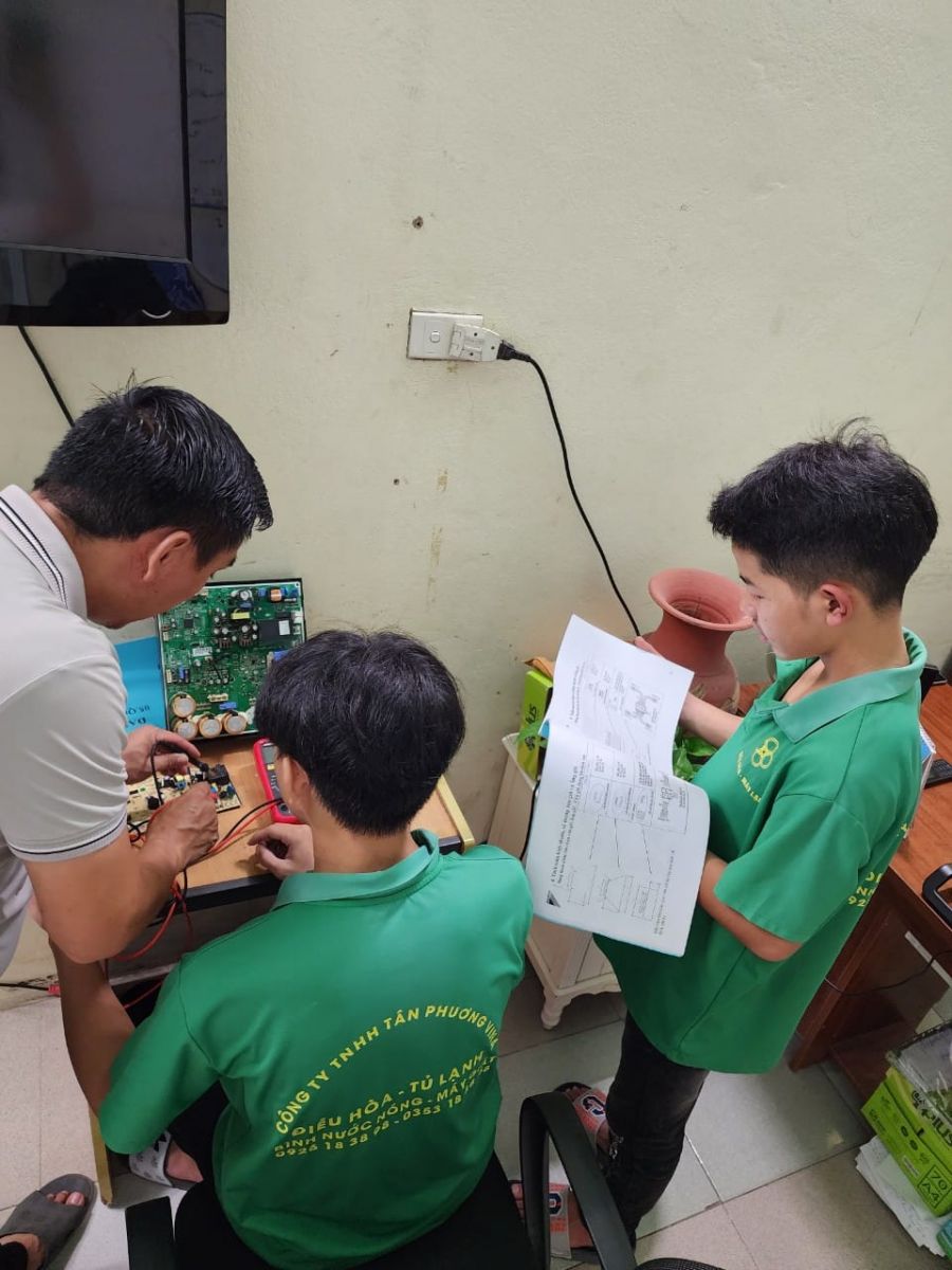 Hai em Giàng A Chứ và Vừ Seo Gió đang học nghề điện lạnh được đào tạo bởi Anh Hải giám đốc công ty
