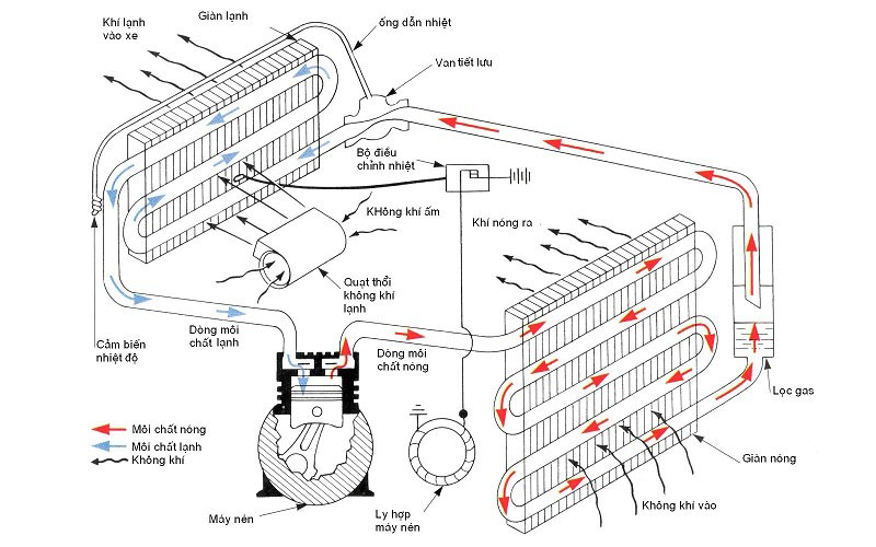 Giàn lạnh sẽ hoạt động liên tục để cung cấp khí lạnh,trong giàn lạnh có 2 bộ phận quan trọng đó là cảm biến nhiệt và board tín hiệu,cảm biến nhiệt sẽ ghi nhận nhiệt độ trong phòng hiện tại và truyền tín hiệu đến board để điều chỉnh khi nhiệt độ trong phòng khác với thông số cài đặt và điều khiển giàn nóng hoạt động,giàn lạnh trong phòng sẽ đóng vai trò hút khí vào để làm lạnh,giàn nóng và môi chất sẽ có tác dụng hút và vận chuyển khí nóng ra ngoài.