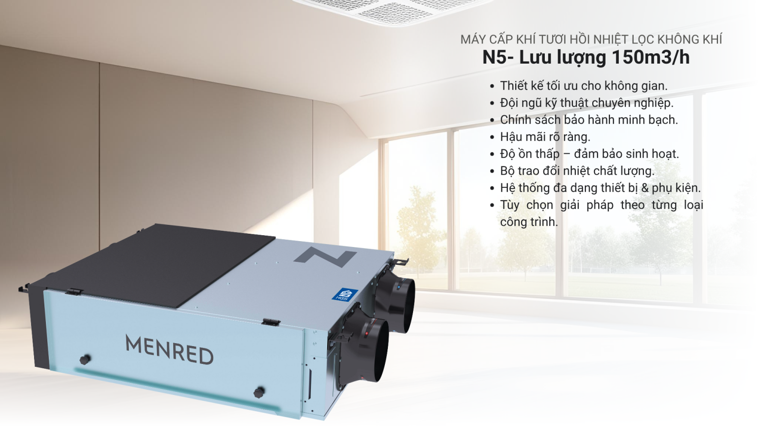Máy N5.150 là sự lựa chọn hoàn hảo cho các phòng có diện tích 40m² – 50m², như phòng ngủ hoặc phòng khách. Máy cung cấp khí tươi sạch, giúp duy trì môi trường sống thoải mái, dễ chịu và tiết kiệm năng lượng. Đây là một giải pháp tuyệt vời cho các không gian không quá lớn nhưng cần đảm bảo không khí trong lành suốt cả ngày.