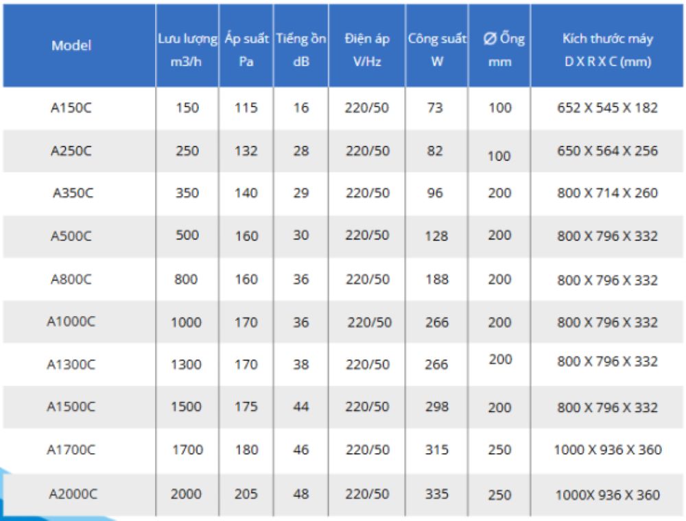 150 m³/h 1–2 phòng ngủ (dưới 5 người)