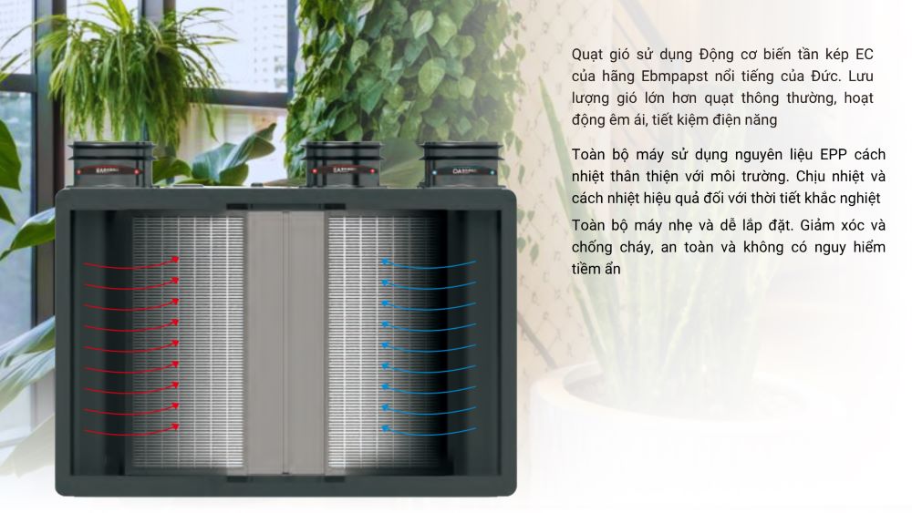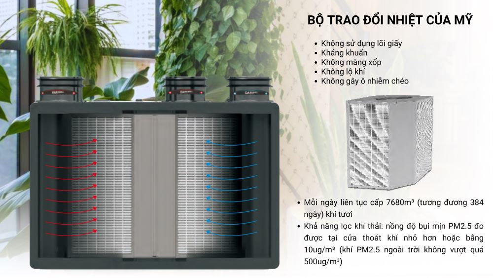Máy trang bị Bộ trao đổi nhiệt giúp cân bằng nhiệt độ trong nhà, tiết kiệm điện năng khi sử dụng chung với điều hòa không khí.