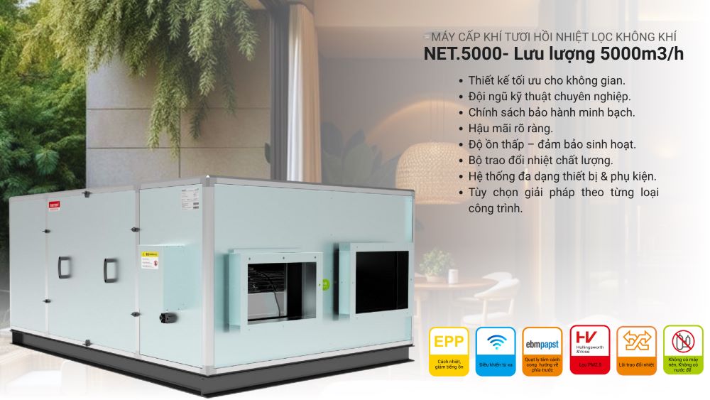 Máy NET.5000 được tích hợp công nghệ thu hồi nhiệt (ERV) kết hợp với quạt gió hiệu suất cao từ ebmpapst – CHLB Đức, giúp tái sử dụng năng lượng từ khí thải để làm mát hoặc làm ấm luồng khí mới đi vào nhà.