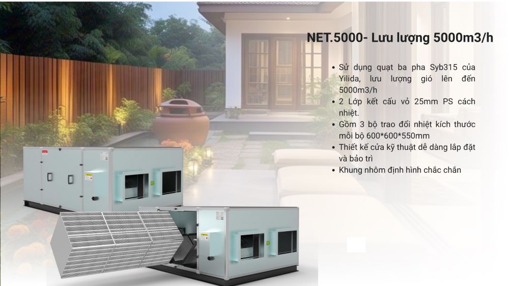 Máy NET.5000 với lưu lượng 5000 m³/h được thiết kế để phục vụ cho các không gian có diện tích từ 1000–1700m², rất phù hợp cho nhà ở nhiều phòng, biệt thự, căn hộ cao cấp, văn phòng hoặc các khu vực sinh hoạt đông người.