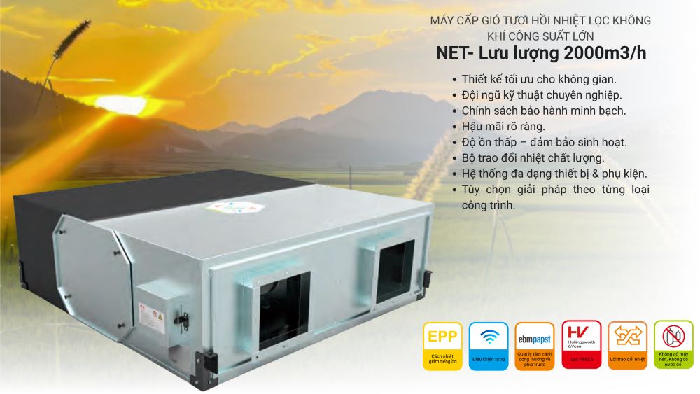 Máy NET.2000M3/h đến từ Hagisu không chỉ là một sản phẩm cấp khí tươi đơn thuần, mà là hệ thống cung cấp giải pháp toàn diện về lọc không khí, cấp khí tươi và thu hồi nhiệt. Với lưu lượng 1200-2000m3/h tương đương với những ngôi nhà có diện tích từ 400-600m2.