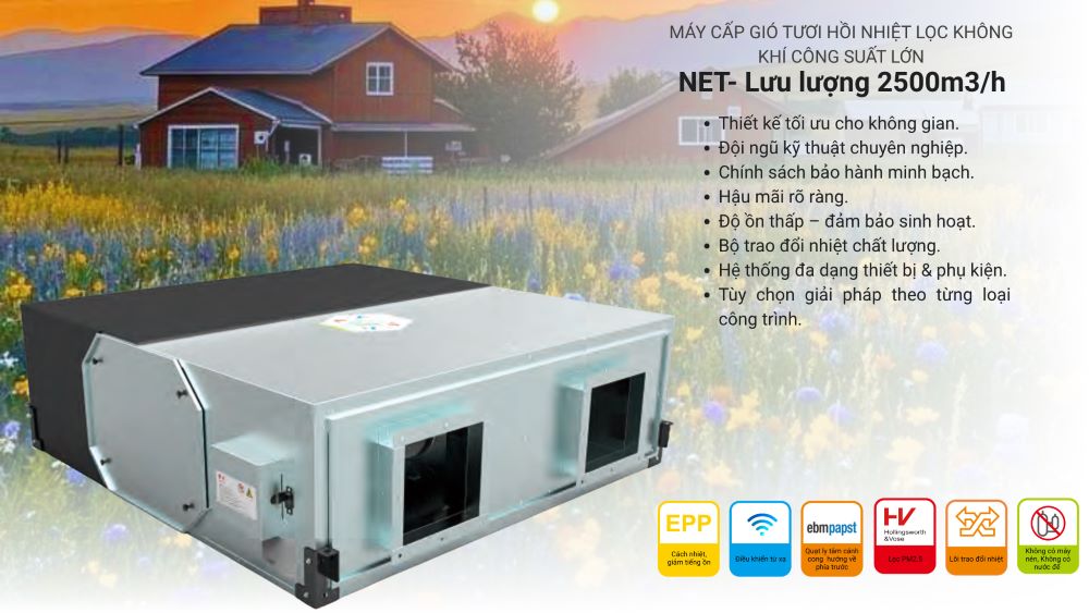 Không chỉ tại TP.HCM, Hà Nội mà rất nhiều đô thị lớn hiện nay đang đối mặt với tình trạng ô nhiễm không khí nghiêm trọng, đặc biệt là nồng độ bụi mịn PM2.5 và các chất gây hại ngày càng gia tăng. Máy cấp khí tươi NET.2500 giúp mang luồng khí sạch từ ngoài trời vào trong nhà, đồng thời lọc sạch bụi mịn PM2.5, vi khuẩn, nấm mốc, khói thuốc và các mùi khó chịu trước khi đưa đến các phòng.