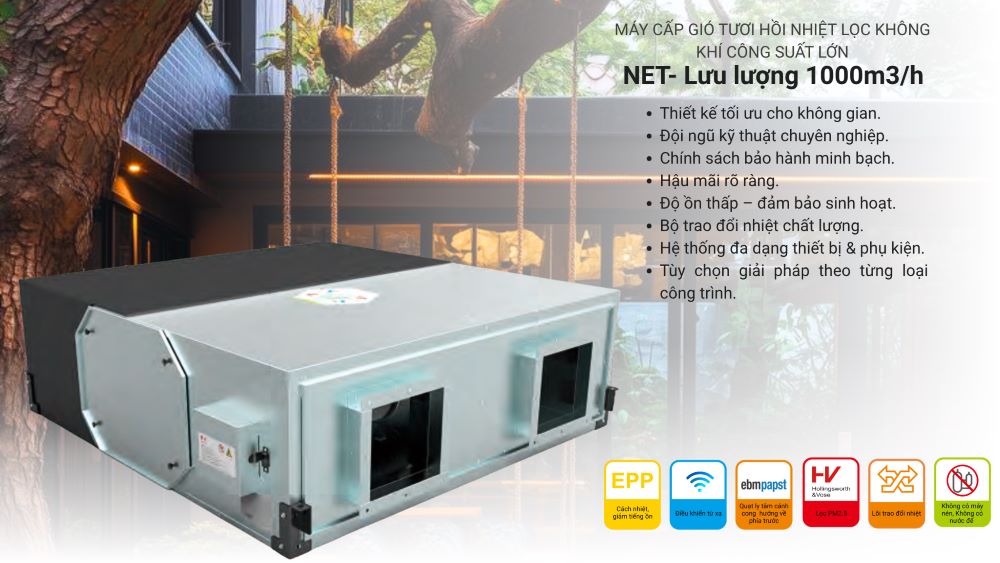 Không chỉ tại TP.HCM, Hà Nội mà rất nhiều đô thị lớn hiện nay đang đối mặt với tình trạng ô nhiễm không khí nghiêm trọng, đặc biệt là nồng độ bụi mịn PM2.5 và các chất gây hại ngày càng gia tăng. Máy cấp khí tươi NET.1000 giúp mang luồng khí sạch từ ngoài trời vào trong nhà, đồng thời lọc sạch bụi mịn PM2.5, vi khuẩn, nấm mốc, khói thuốc và các mùi khó chịu trước khi đưa đến các phòng.