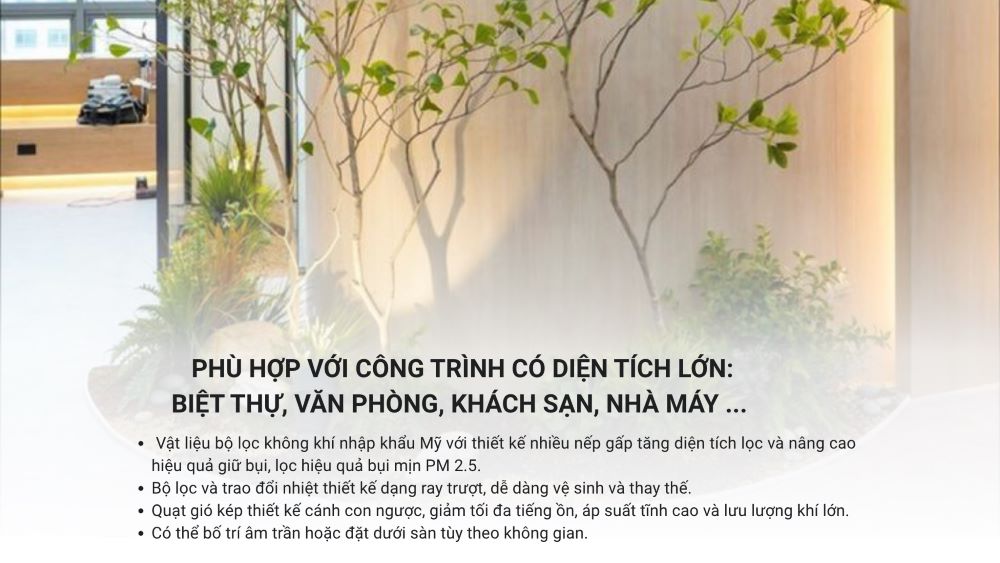 Với công suất lớn và khả năng kết nối tới nhiều đầu cấp khí, hệ thống giúp phân phối không khí sạch đồng đều đến từng không gian, mà vẫn đảm bảo sự yên tĩnh, tiết kiệm điện năng và giữ nguyên tính thẩm mỹ cho nội thất.