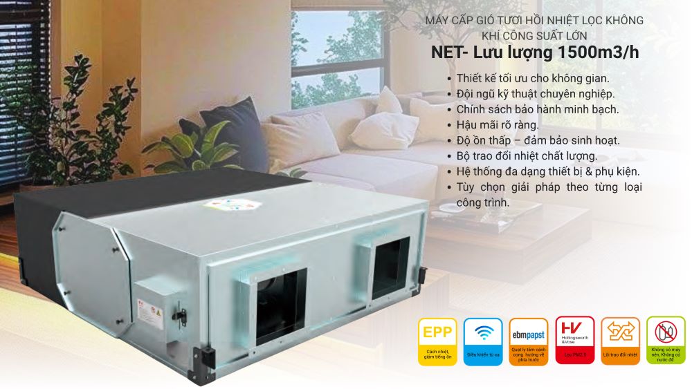 Máy NET.1500 với lưu lượng 1100–1500 m³/h được thiết kế để phục vụ cho các không gian có diện tích từ 300–500m², rất phù hợp cho nhà ở nhiều phòng, biệt thự, căn hộ cao cấp, văn phòng hoặc các khu vực sinh hoạt đông người.